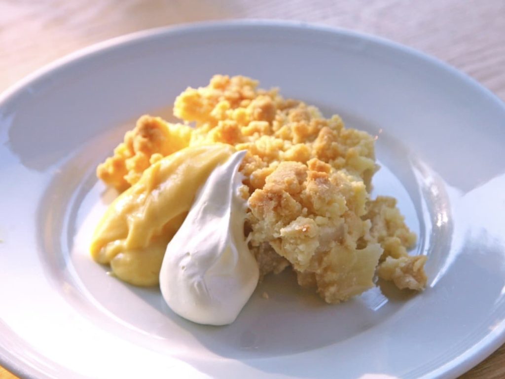 ソテーされた甘酸っぱい紅玉リンゴとザクザクとした食感が楽しいクラム生地のバランスがよく、添えたクリームとカスタードがデザートをより一層ひきたててくれます。あたたかいデザートは、寒い冬にピッタリです。