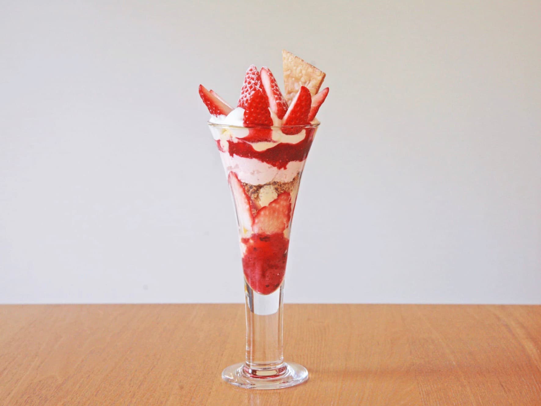 すべての層にたっぷりとあきひめを使用したパフェは、イチゴのおいしい香りでいっぱいです。
