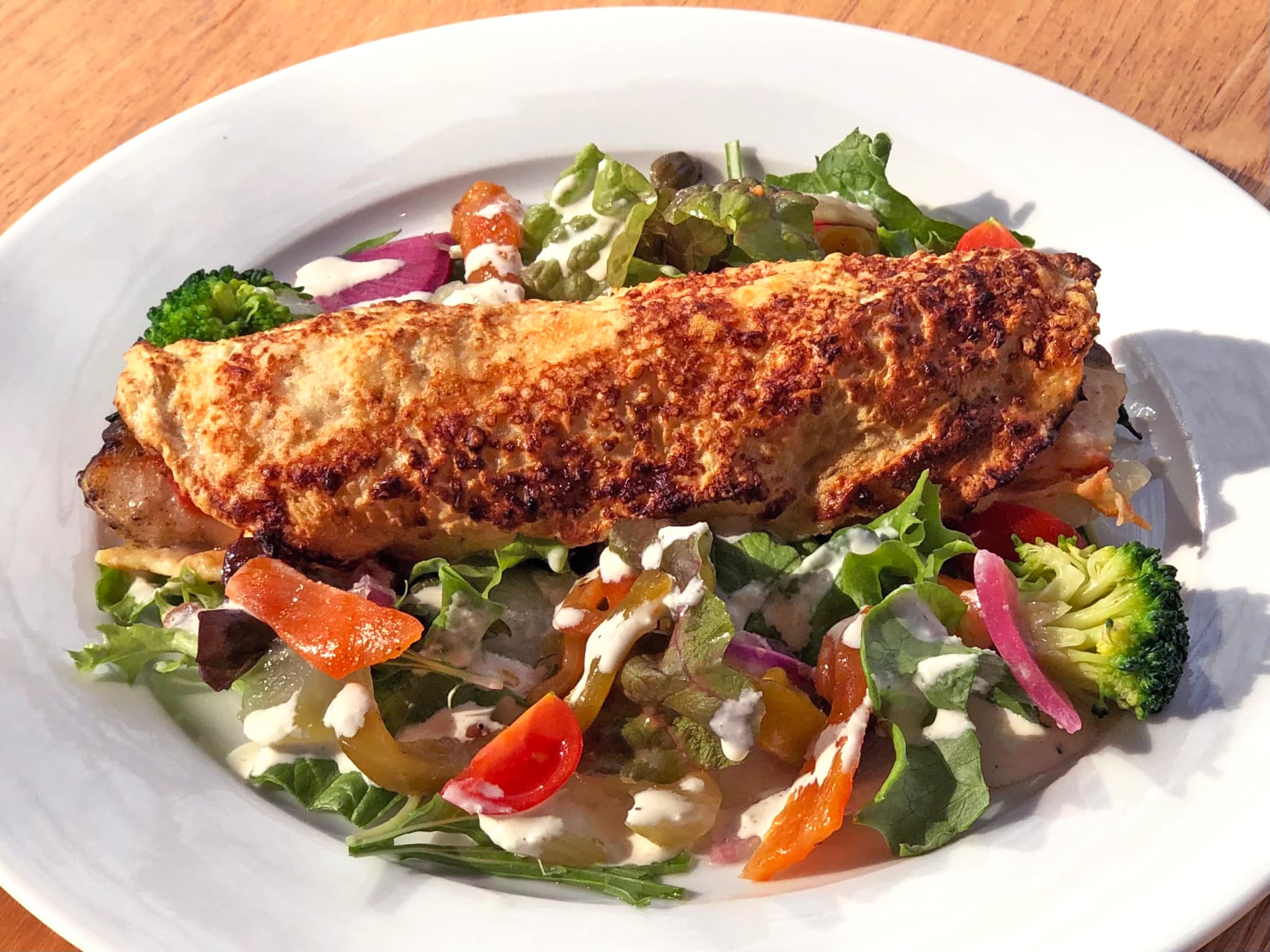 マッシュポテトと野菜を一緒にクレープで包み、チーズを乗せて焼き上げています。添えられた彩り鮮やかな春野菜と合わせて召し上がっていただきます。