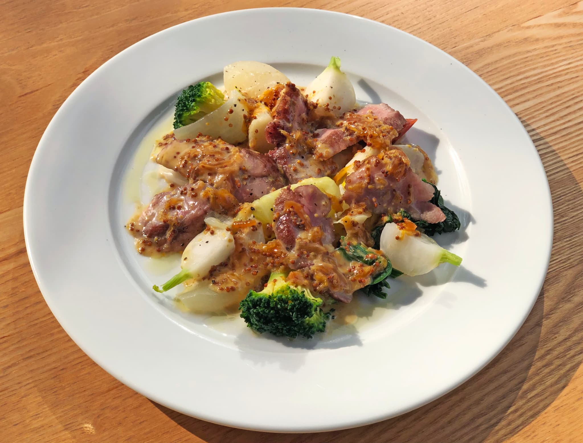 豚肩ロースのローストと地元でとれた新鮮な野菜をご一緒に。